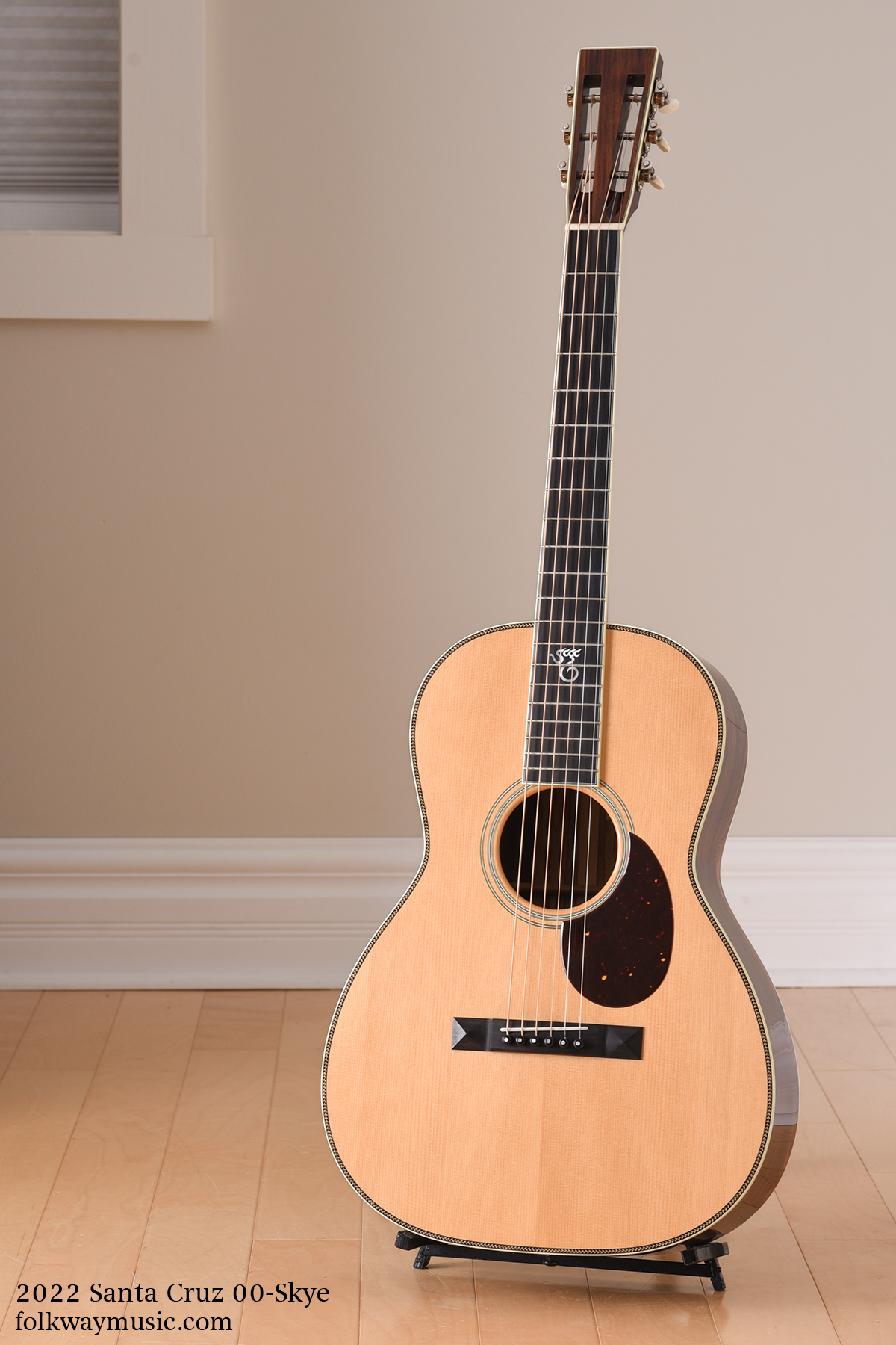The Santa Cruz 00-Skye is a uniquely appointed 00-sized 12-fret fingerstyle model co-designed by Santa Cruz Guitar founder, Richard Hoover, and award-winning fingerstyle acoustic jazz instrumentalist, Eric Skye. Based on SCGC’s 00 model, the 00-Skye features a 24.9” scale neck with 1-13/16” nut and 2-1/4” string spacing at the bridge. The back and sides are cocobolo, and the Adirondack spruce top is X braced with Adirondack stock and hide glue. The 00-Skye also features an increased body depth for added bass and volume (the body tapers from 4-1/8” at the endpin to 3-3/16” at the neck). Scalloped and forward positioned braces, distinctive herringbone trim and ivoroid rosette, mitred wooden purflings, zigzag back strip, bound fretboard and headstock. Gloss nitrocellulose lacquer finish with matte-finished neck.
