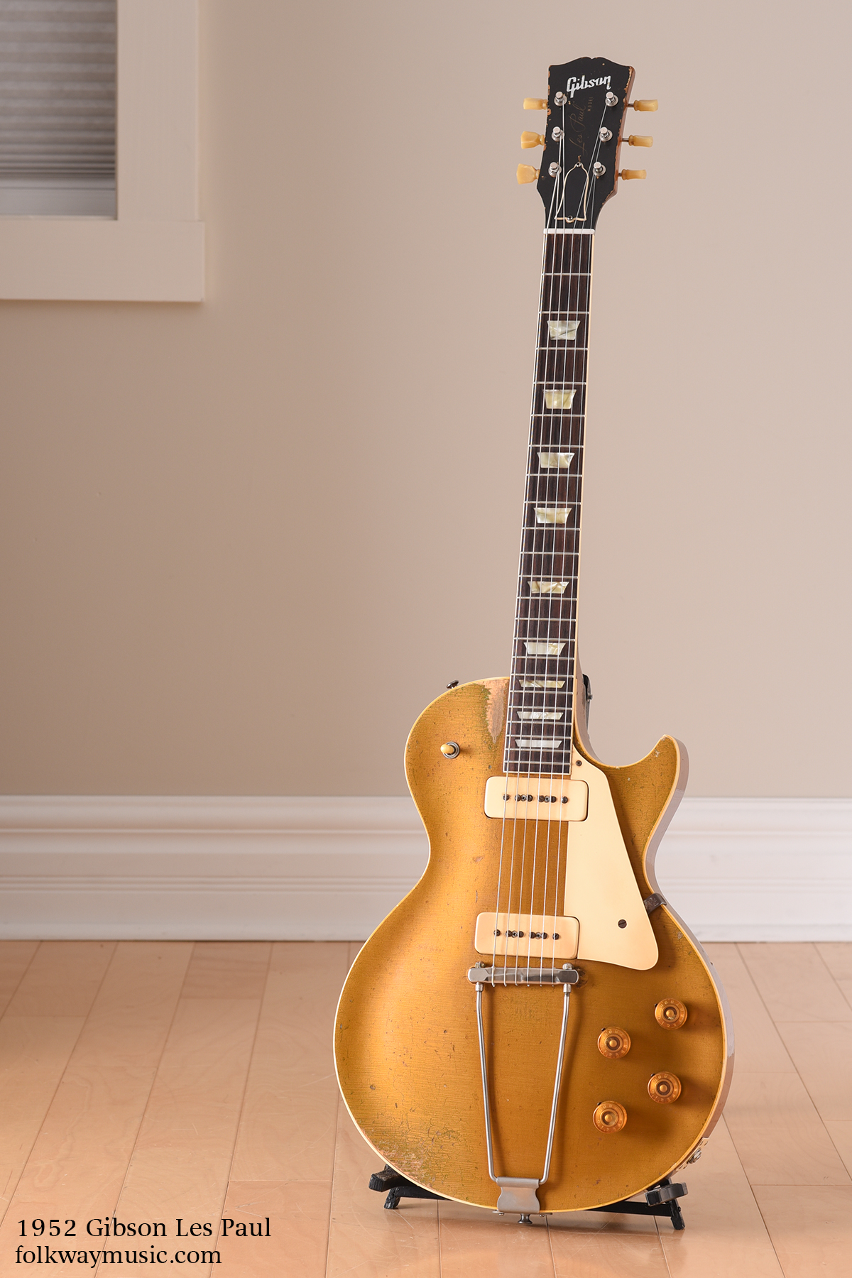 The addition of the Les Paul signature model guitar to the Gibson lineup in 1952 marked a major turning point for the company. With the success of Leo Fender's Broadcaster (soon rebranded Telecaster) in the very early 1950s, Gibson took note of the shift that was occurring in the guitar market and bet on the inevitability of success for the solid body electric guitar. Led by Gibson's president Ted McCarty, the company began developing their first solidbody guitar in 1951. McCarty felt that enlisting a notable guitarist to endorse this new type of guitar was the best way to market the instrument and, guitar virtuoso Les Paul was chosen as the right person for the role. Les Paul’s now familiar signature graced its first headstocks in 1952, the year this particular Gold Top was built.