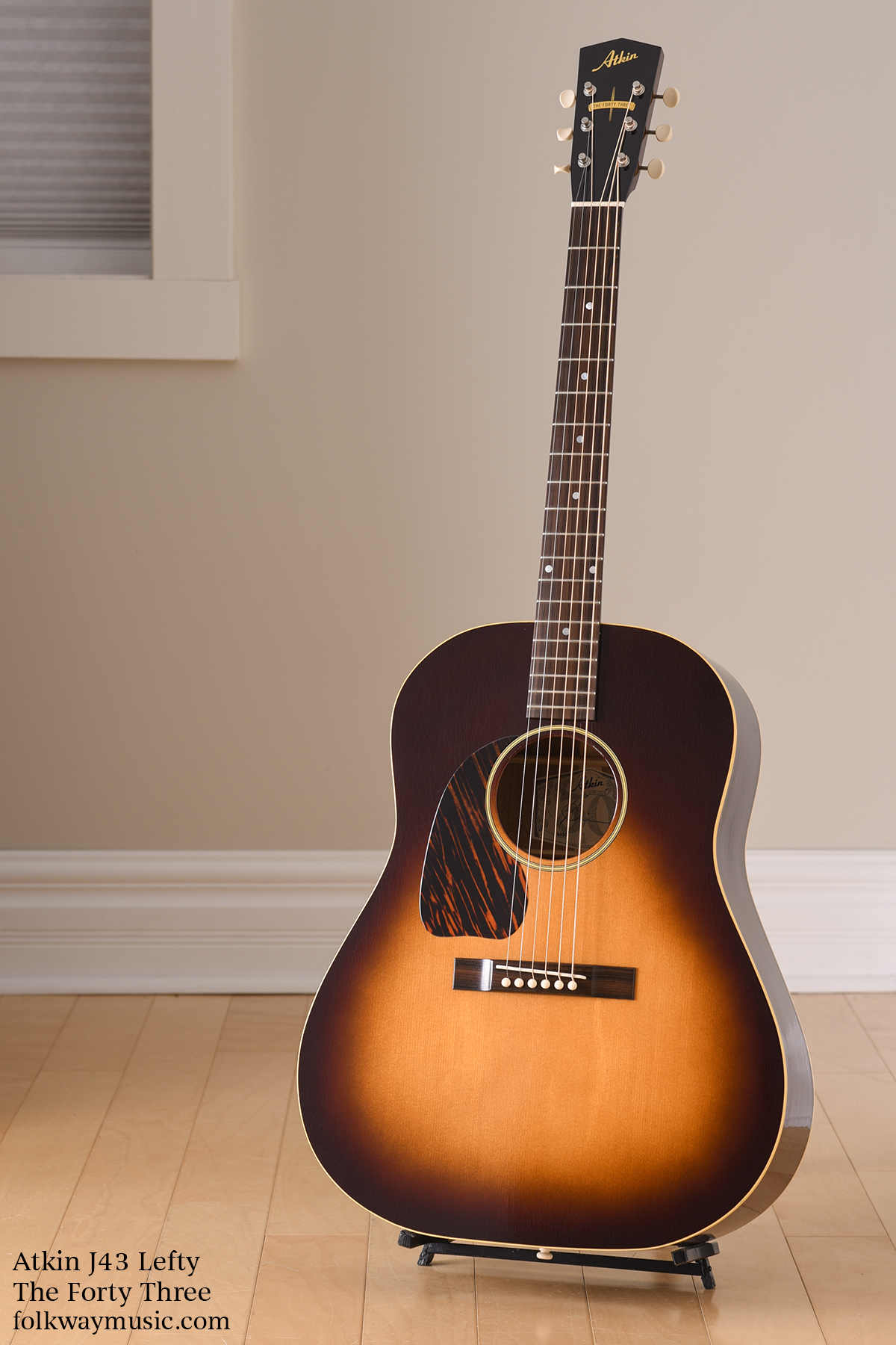 This Atkin J43 Lefty features a sunburst top, firestripe pickguard, simple appointments, bone nut and saddle, and strip-style tuners. The lacquer finish has a gently aged look with gentle craze lines throughout.