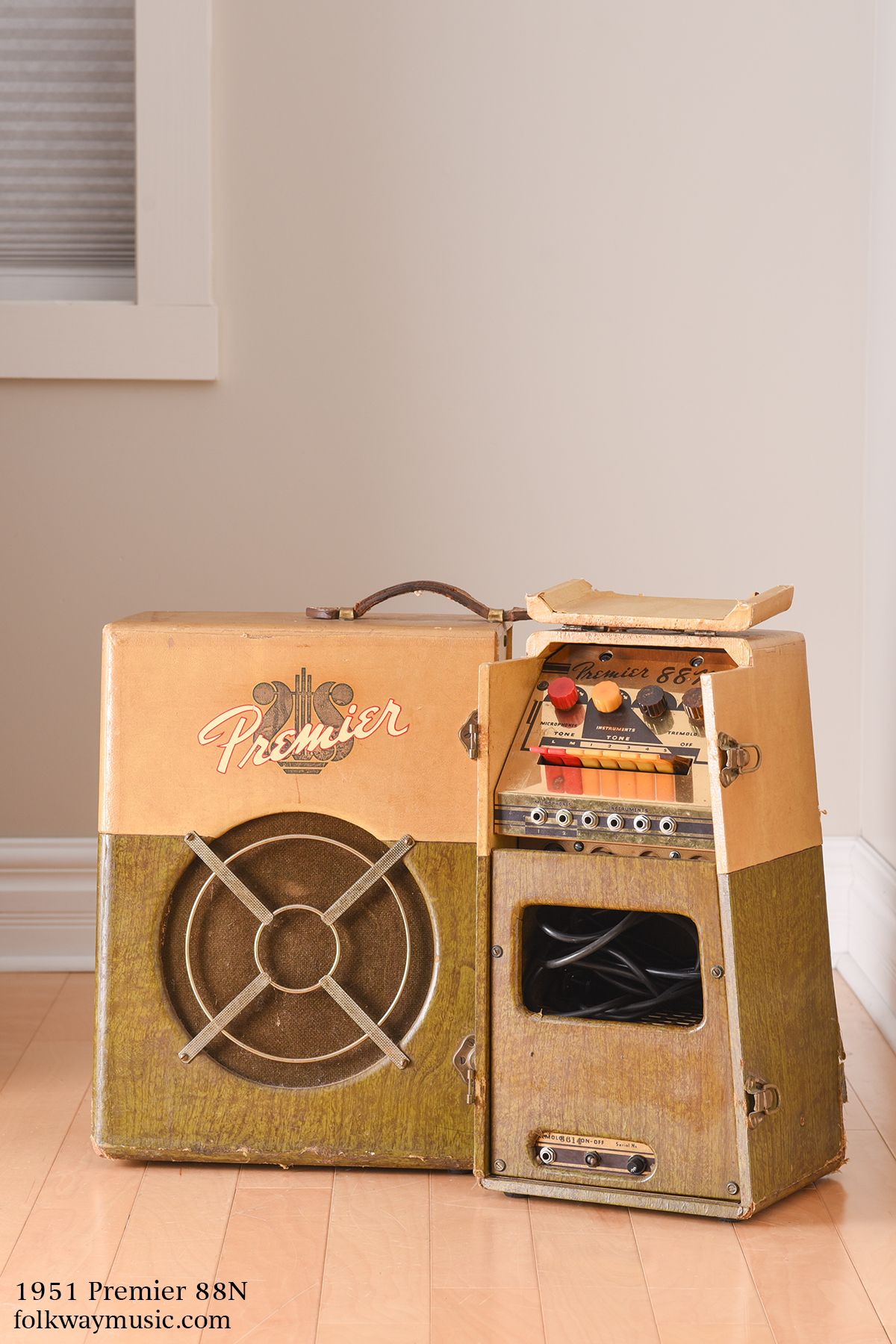 The Premier 88N is a 6L6 powered amp with about 25 watts of power on offer. The cabinet features an original Jensen F12Q 12" speaker. The amp is largely original apart from the typical components replaced during general servicing and an upgraded grounded power cable.