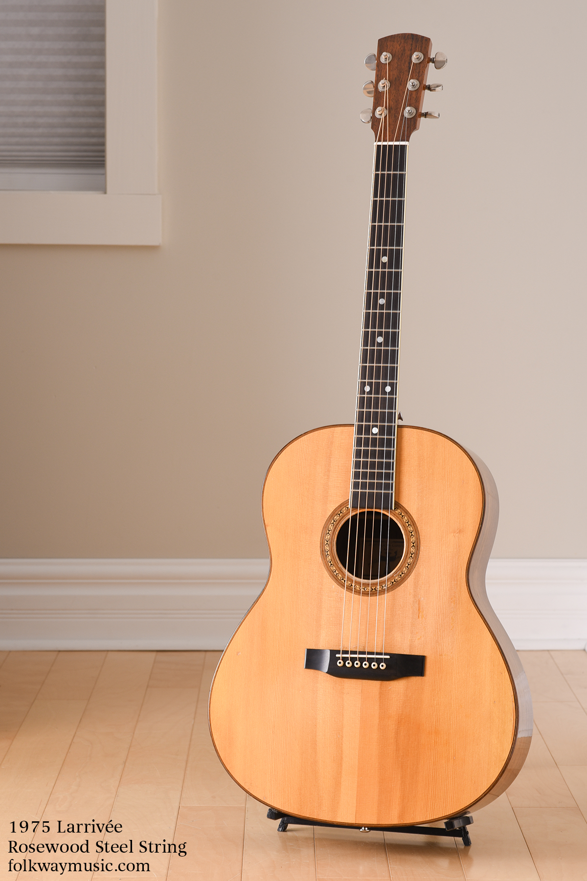 This example is built of Indian rosewood and German spruce and is of Jean Larrivée’s standard steel string shape. This guitar went on to become known as the L-09 when Larrivée expanded and standardized the company’s offerings following his move to Victoria, BC, in 1977.
