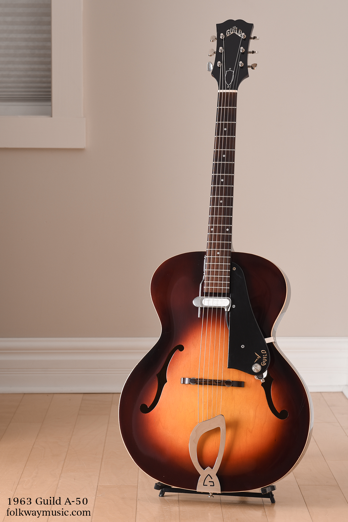 A wonderful early '60s build, this 1963 Guild A-50 is in excellent condition and presents beautifully. The original sunburst finish remains very well preserved, showing only minor signs of play wear throughout. This A-50 is completely original apart from an added Guild-branded DeArmond pickup and a replacement nut. The original frets are in very good condition with only minor wear.