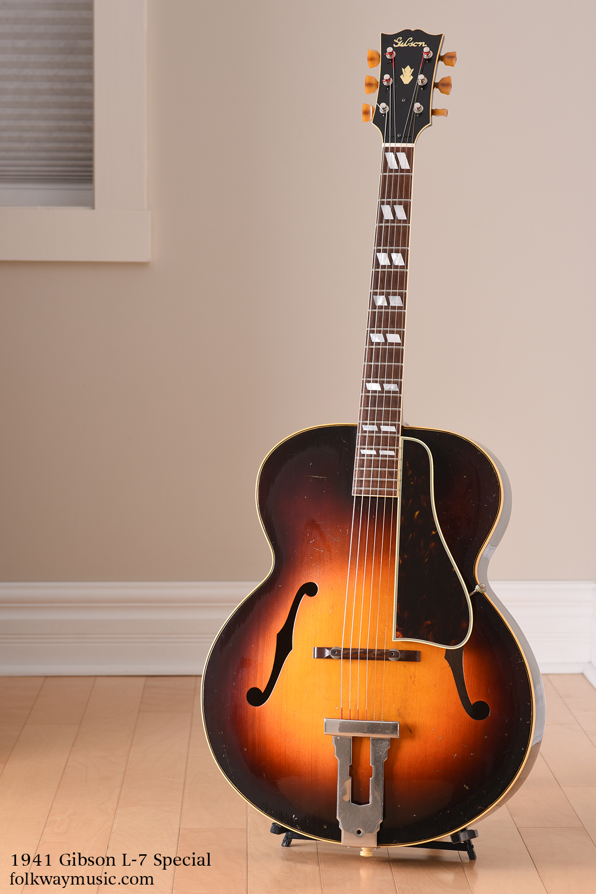 Shipped from Kalamazoo to John J. Billek, a Gibson Teacher-Agent in Scranton, Pennsylvania on May 26th 1941, this late Pre-War Gibson L-7 was special ordered with an L-5 style tailpiece in nickel with Varitone angle adjuster, and a set of matching Kluson Sealfast tuners with Catalin buttons. Like other 1941 Gibsons, this L-7 features bold top and back purflings and the fat pearl script-logo that is particular to the late pre-war and wartime era.